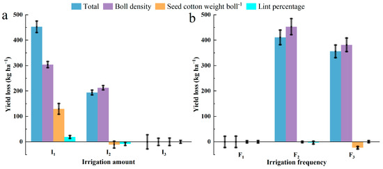 Yield loss contributions attributed to individual yield components for different irrigation amounts during the 2021 cotton growing season (a) and for different irrigation frequencies for the 2020 cotton growing season (b). Lint yield was considered a product of boll density, seed cotton weight boll−1, and lint percentage. Values are means ± standard error (n = 9).