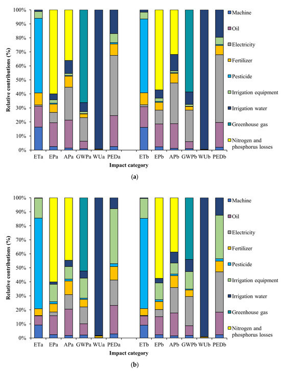 Relative contribution of different parts to each impact category. The suffixes a and b for each environmental impact represent the years 2021 and 2022, respectively. The four sub-figures (a–d) represent the relative contribution of each component to each type of impact for transplanting rice, dry direct-seeding rice, dry direct-seeding rice with polyethylene (PE) film, and dry direct-seeding rice with biodegradable film, respectively.