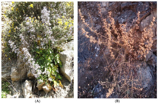 The monotypic plant Petromarula pinnata (Figure 1) of Campanulaceae thrives as a chasmophyte in crevices of limestone cliffs, usually in semi-shaded places across the island of Crete, and it may also be found frequently on the stone walls of old buildings and fortresses [4,5]. Its distribution ranges from sea level up to 800 or even occasionally up to 1300 m a.s.l. It flowers during April and May or later, depending on altitude and slope [5]. Hence, P. pinnata is considered a widely scattered hemicryptophyte in Crete [4,5], occurring in almost all of the island’s regions (http://www.cretanflora.com/petromarula_pinnata.html, accessed 17 January 2024). It is a local single-island endemic plant that is currently assessed as ‘Vulnerable’ [26].