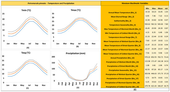 Ecological profile across the natural distribution range (http://www.cretanflora.com/petromarula_pinnata.html, accessed 17 January 2024) of wild-growing Petromarula pinnata populations in Crete (n = 51) linked in GIS with geodatabases (WorldClim version 2.1) to provide values for the following: (A) minimum temperature per month (°C), (B) maximum temperature per month (°C), (C) average temperature per month (°C), (D) precipitation per month (mm), and (E) calculated values for 19 bioclimatic variables. For (A–E), the minimum, maximum, average, and standard deviation are shown based on data from 1970–2000. The colors of the plotted lines illustrate the minimum (blue), maximum (gray), and mean (orange) monthly values for temperature (°C) and precipitation (mm).