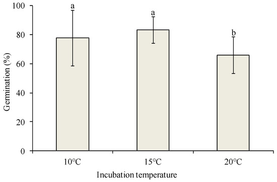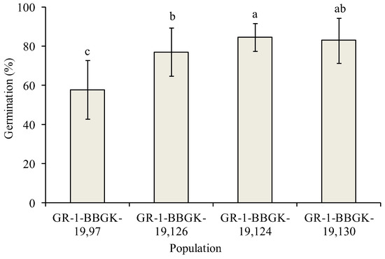 According to the results of the statistical analysis, the main effects, population and incubation temperature, significantly affected the germination of P. pinnata seeds, as did their interaction (Table 2). In detail, the seeds of population GR-BBGK-1-19,97, which was collected from the highest altitude, exhibited the lowest germination rate (Figure 3). Additionally, the germination rate of population GR-BBGK-1-19,124 was higher than that of population GR-BBGK-1-19,126 (both collected at lower altitudes). The germination rate of seeds incubated at 20 °C was the lowest, while no statistical difference was observed between the germination rates of seeds incubated at 10 and 15 °C (Figure 4).