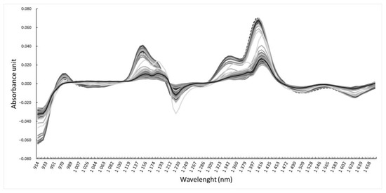 Figure 1 shows the average spectra of the first Savitzky–Golay derivative, obtained from the 88 samples. It shows the most differentiating wavelength ranges between the corn samples.