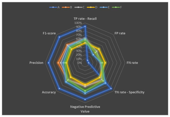 To emphasize the commitment to robust methodologies, an essential element of sustainable practices, the evaluation of various validation methods becomes important. The detailed model performances are presented here. A detailed analysis of performance in terms of the ROC curve (receiver operating characteristic) and true positive (sensitivity) and false positive (1—specificity) rates at different classification thresholds reveals differences. Model A stands out with a remarkably high area under the ROC curve (AUC) of 0.9658, indicating a unique ability to discriminate between positive and negative classes. In contrast, Models B, C, D, and F display the lowest AUC around 0.6; this suggests a less robust separation between classes. Model E shows intermediate performance, with an AUC of 0.71. Evaluating the true positive (recall) rates in each model offers significant insight into their ability to correctly identify positive cases from the pool of true positives. Model A stands out with an exceptionally high recall of 91%, underlining its remarkable ability to detect positive cases. In contrast, Model D has the lowest recall at 50%, indicating a poorer ability to identify these cases compared to the other models. Models B, C, and E show relatively similar recalls, hovering around 60–61%, demonstrating similar performance in detecting positive cases. Model F, with a recall of 57%, is positioned between models B, C, and E. An analysis of the false positive rates (FP rate) indicates their ability to avoid misclassifying negative samples as positive, which is of great importance in the context where the positive case is defined by the presence of a high level of zearalenone. Model A stands out with the lowest FP rate at 9%, suggesting an excellent ability to minimize false positives. In contrast, Models B, E, and F show relatively similar FP rates, but Model B stands out with the highest FP rate at 36%, indicating a tendency to incorrectly classify a significant number of negative samples as positive. Model D has the highest FP rate at 48%, underlining a lesser ability to avoid these misclassifications. An evaluation of the false negative rate (FN rate) indicates the ability of the CART model to avoid the misclassification of positive samples as negative. Model A stands out with the lowest FN rate at 9%, making it the most effective at minimizing false negatives and correctly identifying positive cases. Conversely, Model D has the highest FN rate at 50%, suggesting that it can easily miss some positive cases. Models C and E show relatively similar FN rates, varying around 39–40%, demonstrating comparable performance in detecting positive cases. An evaluation of the true negative rates (TN rate) indicates their ability to correctly classify negative samples. Model A stands out with the highest TN rate at 91%. Models B, E, and F have relatively similar TN rates, around 64–71%. Model D, on the other hand, has the lowest TN rate at 52%, indicating a lower ability to avoid false positives than the other models. The evaluation of negative predictive values (NPV) offers a very important insight into their ability to accurately predict negative cases among all negative predictions. Model A stands out with the highest NPV at 91%. Conversely, Model B has the lowest NPV at 56%. Models C and D are relatively close in NPV, with Model D at 55%. On the other hand, Models E and F stand out with higher NPVs, reaching 76% and 70%, respectively.
