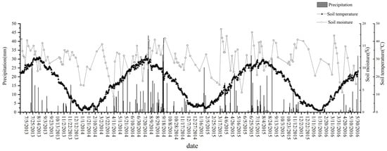 At the same time as the gas sampling, soil samples were collected from a 0–15 cm soil layer and the NH4+- N, NO3−-N, and moisture content in the soil were measured. The soil NH4+-N and NO3−-N contents were determined via extracting 2 mol/L of KCl at a soil/solution ratio of 1:5 (a 20 g soil sample and 100 mL KCl solution) and shaking for 60 min at 300 r/min at 25 °C with a mechanical shaker. After filtering through a filter paper, the extracts were analyzed with a continuous-flow analyzer (Skalar, Breda, The Netherlands). The soil moisture was measured in the 25 g soil samples by drying at 105 °C for 8 h. An Automatic Weather Station was used to obtained the meteorological parameters, including the soil temperature and precipitation.