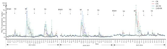 Temporal variations in the NH4+-N concentrations in the soil. The arrows mark management actions. BF: basal fertilizer; TD: topdressing; H: herbicide; CK: no urea fertilizer; CN: urea N fertilizer; AC-FE: acetochlor-fenoxaprop-ethyl; and 2,4D-DI: 2,4D-dicamba.