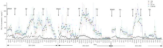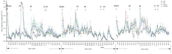 The cumulative precipitation during the measurement periods was 345.6, 568.0, and 390.2 mm in the 2013–2016 growing seasons (with an average of 434.6 mm), and the soil temperature was 15.49 °C, 15.98 °C, and 15.70 °C for the same seasons (with an average of 15.72 °C). The annual average soil moisture was 13% each year (Figure 1). The variation in the NH4+-N content of the CN and herbicide treatments was essentially the same. For the N fertilizer treatments, the NH4+-N concentrations usually reached their peak on the first day after N application, which then subsequently declined to non-fertilized levels within 3–5 days (Figure 2). The soil NO3−-N concentrations reached their peak around 15–20 days after fertilization and then gradually decreased (Figure 3). No significant differences were observed in the NH4+-N and NO3−-N concentrations or in the annual cumulative fluxes (p > 0.05) between the two combined herbicide treatments and the CN treatment in any of the maize and wheat seasons (Figure 3).