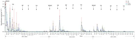 Temporal variations in the denitrification in the soil. The arrows mark management actions. BF: basal fertilizer; TD: topdressing; H: herbicide; CK: no urea fertilizer; CN: urea N fertilizer; AC-FE: acetochlor-fenoxaprop-ethyl; and 2,4D-DI: 2,4D-dicamba.