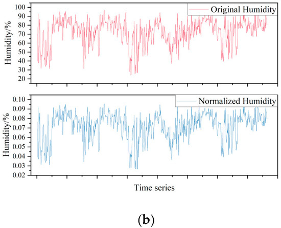 Comparison of curves before and after data normalization: (a) Temperature. (b) Relative humidity.