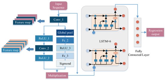 As shown in Figure 3, we preprocessed M × N sequences of historical meteorological data and condition indices and used them as input sequences for this model. In the CNN layer, we set the convolution kernel as 2 convolutional layers of 3 × 1 and the pooling kernel as 2 maximal pooling layers of 5 × 5. The activation function of the convolutional layer is ReLU function and the padding was set to the same. The pooling layer took the overall statistical features of the regions adjacent to a position of the input matrix as the output for that position, with the aim of reducing the number of nodes in the fully connected layer and thus simplifying the network parameters. The convolutional layer and the pooling layer together formed a feature extractor that can maximize the potential information of the input values to be reasonably extracted and also reduce the bias that occurs when the data are extracted by human beings. Therefore, in this study, CNN was firstly used to extract features from the normalized data, and subsequently analyzed and predicted by the LSTM network. The data were extracted from the convolutional layer, as well as from the pooling layer, and the obtained joint feature map was fed into the LSTM layer of the neural network through the SE Attention Mechanism. The LSTM layer mainly learned the features extracted from the CNN layer. The model was built with 8 layers of hidden units to fully learn the extracted features.