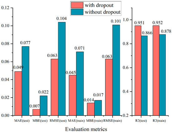 In addition, in order to reduce the interaction between LSTM hidden nodes and decrease the dependence on local features, we added dropout when designing the network. The results are displayed in Figure 4. When we regularized the network using dropout, MAE, MBE, and RMSE were 0.049, 0.007, and 0.063 on the test set, and reached 0.951. It was obvious that the addition of dropout decreased the test data by 0.028, 0.015, and 0.041 in MAE, MBE, and RMSE, respectively, and improved the by 0.085.