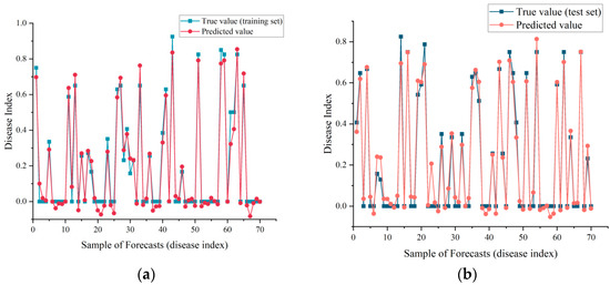Disease index prediction results: (a) Training set prediction results; (b) Test set prediction results. The red line represented the model’s predicted value and the blue line represented the true value.