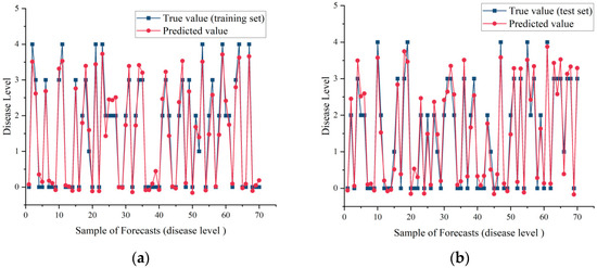 Results of disease level prediction: (a) Training set prediction results; (b) Test set prediction results. The red line represented the model’s predicted value and the blue line represented the true value.