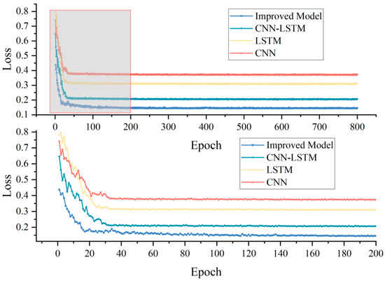 Since the improved model combines CNN, LSTM, and SE attention mechanisms, we compared the performance of CNN, LSTM, and the improved model under the same training parameters and environment. From Table 3, the performance of either the single CNN model or the LSTM model, or the CNN-LSTM model combining the two, was worse than the improved model. Focusing on the test data, the of the improved network was 0.121, 0.155, and 0.013 higher than that of the LSTM, CNN, and CNN-LSTM, in that order, and the RMSE decreased by 0.204, 0.253, and 0.019, in that order. In the loss curves of the training process, we observed that the loss of the improved model was consistently below that of the remaining three models. In particular, for the first 200 Epochs (bottom half of Figure 7), the improved model converged rapidly at the beginning of training (first 20 Epochs), and the loss still fluctuated up to 50 Epochs, and then decays and stabilizes at about 200 Epochs. The results indicated that the model achieved our expectations.
