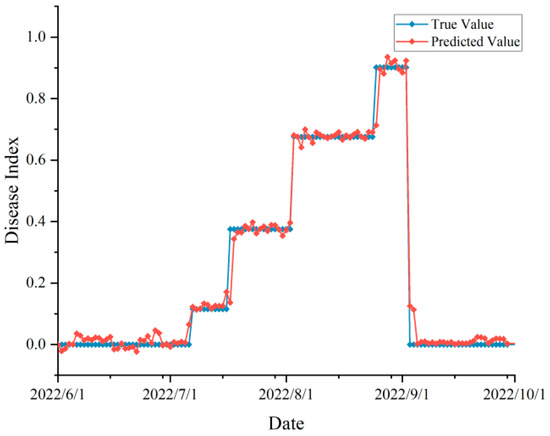 For the disease level, we also obtained better prediction results (Figure 6). We found that although there were differences in the prediction results of the improved network, the error was extremely small after we rounded the prediction results of the disease level, and by using the disease level zero and one, as well as the survey of onset times over the years, we could predict the disease level under future weather forecasts and subsequently infer the onset times.