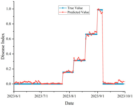 In the validation experiment, we predicted disease occurrence based on time scales (without randomly upsetting the data). Since the disease surveys in 2022 and 2023 were not conducted on a day-by-day basis, they were adjusted to a stage-specific disease index when the data were organized. From the figure, the predicted and actual values were highly consistent with each other, and there was no prediction abnormality, which proved that the proposed model was not overfitting and achieves our expected effect. According to the evaluation indexes, the , MAE, MBE, and RMSE of the data in 2022 were 0.932, 0.043, −0.018, and 0.067, respectively, and the indexes in 2023 were 0.938, 0.045, 0.012, and 0.052, respectively, which was a satisfactory result.
