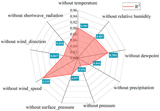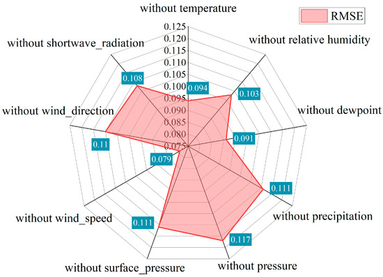In order to gain a deeper understanding of the performance of the peanut leaf spot disease prediction model under the absence of different environmental variables, we retrained the model by masking out one weather element at a time and investigated the impact of each meteorological input feature on model performance metrics, particularly and RMSE. These findings are reflected in Figure 10 and Figure 11.