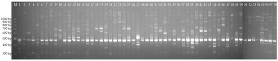 In the scoring process, only robust and distinct bands were taken into consideration. The band pictures that were acquired via the use of iPBS-retrotransposons were scored as binary data, and the results were entered using Excel software. A value of 0 denotes the absence of a band, while a value of 1 represents the presence of a band. Scoring was performed with reference to a 100 bp+ DNA ladder, as illustrated in Figure 2. Using PopGene version 1.31 [33], the effective number of alleles (Ne) and Shannon’s information index (I) were evaluated for each iPBS marker. Nei genetic diversity (H) and polymorphism information content (PIC) were determined using PowerMarker V3.025 software [34]. NTSYS-PC software version 2.02 was used to compute the Dice similarity index, to generate a UPGMA (unweighted pair group method with arithmetic mean) dendrogram, and to create a two-dimensional graph with PCoA (Principal coordinate analysis) [35]. Furthermore, this software was used to perform the Mantel test [36], which calculates the correlation coefficient (r) between the cophenetic values and the Dice similarity index. Using the COPH module, the cophenetic value matrix was initially computed by using the tree matrix that was obtained from the iPBS analysis. The MXCOMP module was used to investigate the goodness-of-fit value (r) representing the relationship between the UPGMA dendrogram and the Dice similarity index matrix [37]. To undertake an analysis of the population structure of wheat varieties, STRUCTURE version 2.3.4 was utilized [38]. The appropriate number of subpopulations (delta K value) was determined using the approach described by Evanno et al. [39] using the STRUCTURE HARVESTER program [40]. The STRUCTURE program was used to determine the expected heterozygosity (He) and fixation index (FST) values that reflect populations [37].