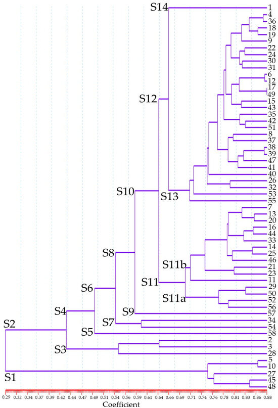 To further analyze the relationships among the 58 wheat genotypes, clustering analysis was conducted using the UPGMA technique, with the Dice similarity index serving as the basis for the study. The resulting dendrogram was utilized to construct the similarity matrix. Subsequently, a Mantel test analysis was performed using the Dice similarity matrix, revealing a correlation coefficient value of r = 0.96011 for the 58 wheat genotypes. This investigation provides valuable insights into the genetic relationships and clustering patterns among the examined wheat genotypes. The dendrogram visually represents variations in similarity levels, spanning from 0.29 to 0.88 (Figure 3). Initially, the dendrogram partitioned the genotypes into two primary clusters, designated as groups S1 and S2. Within the overarching group denoted as S2, additional subsidiary groups were identified. Specifically, subgroups S3 and S4 emerged within group S2. Subgroup S4 further gave rise to groups S5 and S6, with subgroup S6 leading to subgroups S7 and S8. In a similar manner, subgroup S8 contributed to the formation of subgroups S9 and S10, and subgroup S10 resulted in subgroups S11 and S12. Notably, groups S11a and S11b were delineated beneath subgroup S11, while groups S13 and S14 formed under subgroup S12. The dendrogram analysis provided insights into the degrees of separation among major groups and subgroups, denoted as S1, S2, S3, S4, S6, S7, S8, S10, S11, S11a, S11b, S12, and S13, with separation degrees measuring approximately 0.750, 0.430, 0.548, 0.495, 0.541, 0.600, 0.582, 0.640, 0.700, 0.773, 0.710, 0.660, and 0.710, respectively. It is noteworthy that no degree of separation was observed in subgroups S5, S9, and S14 due to the clustering of individual genotypes within these subgroups. This dendrogram analysis effectively portrays the hierarchical relationships and clustering patterns among the wheat genotypes.
