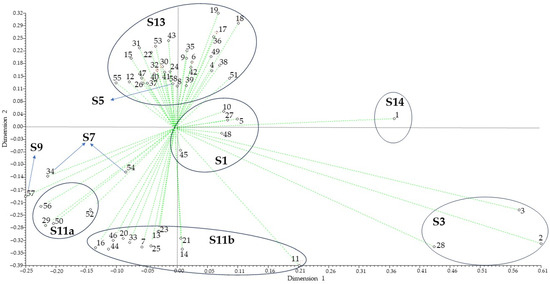The similarity matrix was employed to construct a two-dimensional graph, representing the principal coordinate analysis (PCoA). The cumulative value of the first two principal coordinates accounted for 68.21% of the total variation (Figure 4). The groups that are displayed in Figure 4 and referred to as S1, S3, S5, S7, S9, S11a, S11b, S13, and S14 correspond to those presented in the separated branches in Figure 3. The results from the PCoA analysis revealed that the observed clustering patterns were consistent with the outcomes obtained from the cluster analysis (Figure 3 and Figure 4). This alignment reinforces the robustness and reliability of the observed clustering patterns, providing a coherent representation of the genetic relationships among the wheat genotypes.