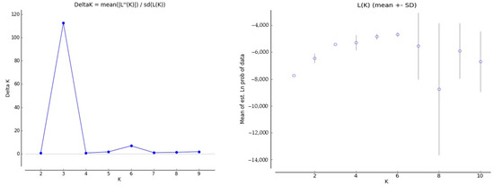 - Evanno, G.; Regnaut, S.; Goudet, J. Detecting the number of clusters of individuals using the software STRUCTURE: A simulation study. Mol. Ecol. 2005, 14, 2611–2620. [Google Scholar] [CrossRef]