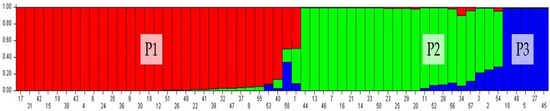 The population structure analysis results (Figure 6) highlight the categorization of the 58 examined genotypes into three distinct subgroups denoted as P1, P2, and P3. Genotypes with a membership coefficient equal to or greater than 0.80 were considered to possess a high level of genetic purity, while five genotypes displayed hybrid characteristics. The average FST values for each subgroup were determined, quantifying population differentiation through allele correlations. Specifically, the FST values were calculated as 0.5353 for P1 (red), 0.4416 for P2 (green), and 0.6934 for P3 (blue). Additionally, the analysis revealed that the P2 population exhibited the highest expected heterozygosity value of 0.1944, while the P1 population had the lowest expected heterozygosity value of 0.1501 (Table 4). These findings provide insights into the genetic structure and differentiation among the identified subgroups, offering a comprehensive understanding of the diversity and purity levels within the studied wheat genotypes. The utilization of membership coefficients and genetic parameters enhances the characterization of distinct populations, contributing valuable information to wheat breeding and germplasm preservation efforts.