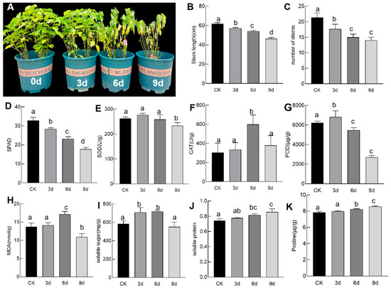 Effects of drought stress on the morphological and physiological characteristics of Qingye ramie. (A) Phenotypic response of ramie cutting seedlings under drought stress. Physiological effects of drought stress on stem length and numbers of stems (B,C), and chlorophyll concentration (D), antioxidant enzyme activity (E–K). The data shown are the means of three replicates (±SD). Means indicated with different letters are significantly different at p < 0.05.