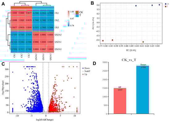 In order to further reveal the response of relevant genes under drought adversity conditions in Qingye Ramie, we performed RNA sequencing at 6 days when drought stress was very pronounced and on the control. The 36 cDNA libraries were prepared from the collected samples, subjected to pairwise sequence analysis, and sequenced by paired-end sequencing. The confidence and reproducibility of the RNA-seq data were demonstrated using Pearson’s correlation analysis (Figure 2A). Analysis of the RNA-seq data was verified for accuracy using PCA plots (Figure 2B), which showed that the expression tendency of the selected genes was the same as that of the relevant transcripts. A total of 4293 DEGs (1497 upregulated and 2796 downregulated) were identified based on the criteria of |fold changes| > 1 and p value < 0.05 (Figure 2C,D).
