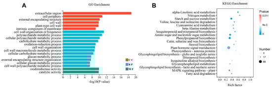 In total, the top 20 GOs enriched included 6 cellular components (CCs), 2 molecular functions (MFs), and 12 biological processes (BPs) (Figure 3A and Supplementary Table S2). Under both the 0 d and 6 d treatments, the highly correlated CC terms were extracellular region (GO:0005576) and cell periphery (GO:0071944), with a significant number of differential genes. In the MF class, the activities of Oxidoreductase (GO:0016491) and catalytic activity (GO:0003824) were enriched after the drought intervention. The most important BP terms were cell wall organization or biogenesis (GO:0071554), polysaccharide metabolic process (GO:0005976), cellular polysaccharide metabolic processes (GO:0044264), carbohydrate metabolic processes (GO:0005975), and oxidation-reduction processes (GO:0055114). Simultaneously, several BP terms were enriched under drought stress, including cell wall organization (GO:0071555), cell wall macromolecule metabolic process (GO:0044036), cellular carbohydrate metabolic processes (GO:0044262), glucan metabolic processes (GO:0044042), external encapsulating structure organization (GO:0045229), cellular glucan metabolic processes (GO:0006073), and cell wall polysaccharide metabolic processes (GO:0010383).