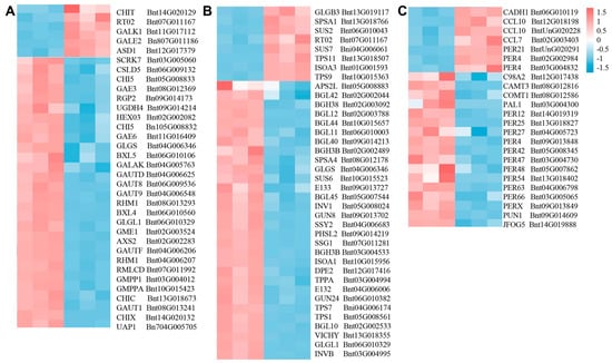 (A) The starch and sucrose metabolism-related genes; (B) the amino sugar and nucleotide sugar metabolism-related genes; (C) the phenylpropanoid biosynthesis-related genes. The data on the left side of the graph are TFs, and the data on the right side are the corresponding gene numbers in Qingye Ramie. Red represents upregulated and blue represents downregulated differential genes.