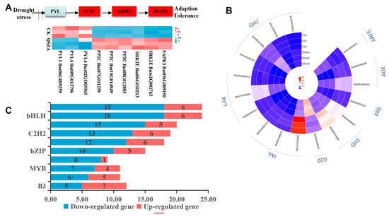 Expression levels of differentially expressed genes (DEGs) involved in plant hormone signaling, MAPK, and transcription factors based on log2 (FC) value after drought stress in Qingye ramie. (A) Enrichment map of MAPK-related genes under drought conditions. (B) Enrichment map of phytohormone-related genes under drought conditions. (C) Top 10 transcription factor families and the number of corresponding members. Red represents upregulated and blue represents downregulated differential genes.