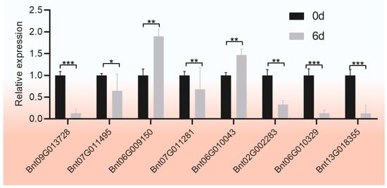 qRT-PCR results of some differentially expressed genes. * represents p < 0.05; ** represents p < 0.01; *** represents < 0.001.