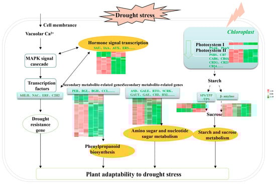 Starch is the primary storage form of photosynthetic substances that provide energy for plant development. However, in the present study, there was an upregulation of SPS (sucrose-phosphate synthase) and TPP (trehalose-phosphate phosphatase) (Figure 7), which degraded starch. As a result, starch deposition was inhibited, which is consistent with findings in wheat [41]. In higher plants, starch metabolic pathways are primarily catalyzed by specific enzymes and genes [42,43,44]. The results showed that the limitation of enzyme activity and the expression levels of their genes inhibited starch deposition, resulting in a decrease in starch content in drought-stressed Qingye ramie. Sucrose is also a significant factor in growth and development under drought stress [45,46]. Genes such as TPS (Trehalose-phosphate synthase) and β-amylase showed significant downregulation. This suggests that prolonged soil drought stress, which reduces the expression level, inhibits sucrose biosynthesis. The results suggest that prolonged soil drought causes a decrease in the deposition of both starch and sucrose in Qingye ramie.