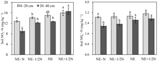 Compared with the NE−N treatment, soil NO3−-N in the 0–20 cm and 20–40 cm layers significantly increased with increasing N fertilization rates (Figure 1). Soil NH4+-N in the 0–20 cm layer did not significantly change across all treatments, whereas NE and NE+1/2N increased NH4+-N of the 20–40 cm soil layer by 21.4 and 25.9%, respectively, compared with NE−N.