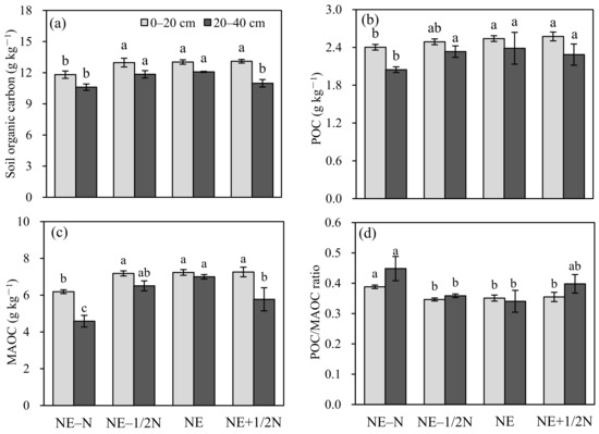 Compared with the NE–N treatment, the application of the N fertilizer increased SOC, POC, and MAOC in the 0–20 cm soil layer by 10.0–11.0%, 3.7–7.3%, and 16.1–17.2%, respectively, but there were no differences in these SOC fractions among the three N fertilization treatments; in the 20–40 cm layer, N fertilization increased SOC, POC, and MAOC by 3.5–13.9%, 11.5–14.4%, and 26.1–52.7%, respectively, but the SOC and MAOC of NE+1/2N were significantly reduced compared with those of NE (Figure 2a–c). Compared with NE−N, N fertilization decreased the POC/MAOC ratio, with the NE treatment showing the largest decrease (24.3% and 10.2% in the 0–20 and 20–40 cm layers) (Figure 2d).