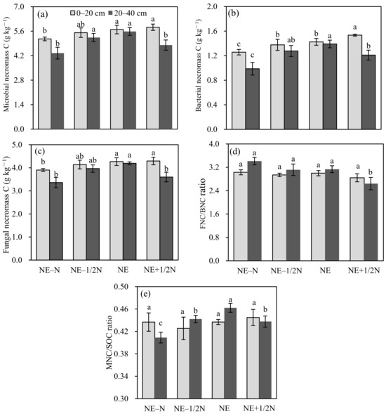 In the 0–20 cm soil layer, the NE−1/2N, NE, and NE+1/2N treatments increased MNC by 7.0%, 10.2%, and 12.9%; increased BNC by 9.2%, 13.1%, and 21.8%; and increased FNC by 6.2, 9.5%, and 10.1%, respectively, compared with the NE−N treatment. There were no differences in MNC and FNC among the three N fertilization treatments (Figure 3a–c). In the 20–40 cm layer, the NE−1/2N, NE, and NE+1/2N treatments increased MNC by 23.3%, 31.4%, and 13.1%; increased BNC by 28.9%, 40.4%, and 22.1%; and increased FNC by 18.0%, 24.9%, and 7.1%, respectively. However, NE+1/2N decreased MNC, BNC, and FNC by 13.9, 13.0%, and 14.2%, respectively, relative to the NE treatment. The FNC/BNC ratio of the 0–20 cm layer did not change across all treatments but showed a gradually decreasing trend with increasing N fertilization, and the ratio in the 20–40 cm layer was slightly higher than that in the 0–20 cm layer (Figure 3d). There was no difference in the MNC/SOC ratio of topsoil among all treatments; however, NE−1/2N, NE, and NE+1/2N increased the ratio in the 20–40 cm layer by 8.0%, 12.9%, and 8.6% relative to the NE−N treatment, respectively (Figure 3e).