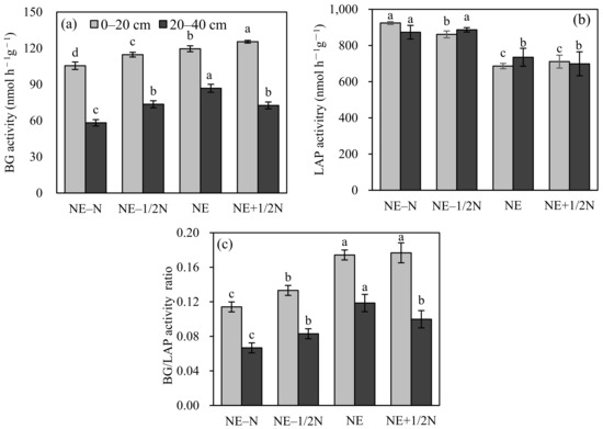 The activity of β-glucosidase (BG) (a) and Leucine-aminopeptidases (LAP) (b) and the ratio of BG/LAP activity (c) in different treatments. Different letters at the top of the columns indicate significant differences among fertilization treatments (p < 0.05).