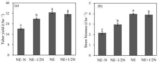 The application of the N fertilizer increased soil N supply and promoted aboveground potato plant biomass accumulation and tuber yield, which increased with increasing N rates (Figure 6). High plant biomass also improved the production of root exudates and returning these straw residues to the field and stubble retention increased organic C input [24].