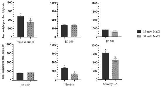 Impact of salinity stress on fruit weight per plant (g/plant) for each pepper genotype. In the figure, the entry labeled ‘0.5 mM NaCl’ denotes the control conditions, indicating the absence of added NaCl. On the other hand, ‘30 mM NaCl’ is indicative of exposure to salinity stress. For each treatment, the different letters in each bar indicate significant differences according to Duncan’s multiple range test (p < 0.05). Vertical bars indicate the standard errors of means (n = 4).