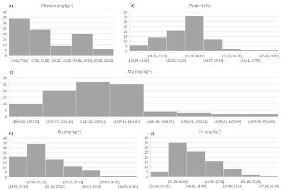 Histograms of protein, phytate, Mg, Fe, and Zn concentration in wheat grain (n = 93); (a) phytate (mg kg−1): mean ± SD = 10.82 ± 4.94; CV = 45.6%; (b) protein content (%): mean ± SD = 13.29 ± 1.26; CV = 9.50%; (c) Mg (mg kg−1): mean ± SD = 1300 ± 133; CV = 10.2%; (e) Fe (mg kg−1): mean ± SD = 39.14 ± 6.55; CV = 16.70%; (d) Zn (mg kg−1): mean ± SD = 21.31 ± 5.03; CV = 23.60%.