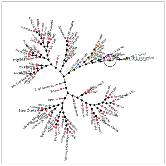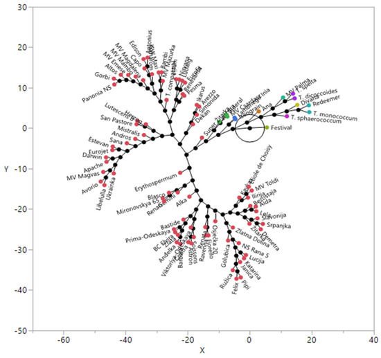 Hierarchical clustering of wheat genotypes was performed using the centroid method. The traits used for clustering were protein content in grain, phytate concentration, and Mg, Fe, and Zn concentration in grain. The constellation plot (Figure 2) is organized into 10 clusters, which corresponds to 10 different colors. The largest cluster comprised 79 out of 93 genotypes and is characterized by the fact that all measured values are just below the mean values of the examined germplasm (Table S3). The remaining 14 genotypes were distributed across 9 individual clusters and are shown in different colors on the constellation plot. The genotypes Ana (CRO), MV Palma (HUN), Divana (CRO), accession T. sphaerococcum (WR), and Festival (FRA) were separated as distinct clusters based on their characteristic traits (Table S5). The Ana genotype (CRO) was characterized by the highest Mg concentration (1767 mg kg−1) and the second highest Fe concentration (55.58 mg kg−1) in the grain compared to all genotypes. The Hungarian genotype MV Palma had high phytates (16.43 mg kg−1), Fe (49.91 mg kg−1), and Zn (32.60 mg kg−1) concentrations. Low phytates and above mean values of protein (17.04%), Mg (1613 mg kg−1), and Fe (46.39 mg kg−1) were found in Divana (CRO). The highest concentration of phytates (18.11 mg kg−1), protein (17.50%), and Zn (39.65 mg kg−1) was found in the wild relative accession T. sphaerococcum. The French genotype Festival had the highest Fe concentration (62.06 mg kg−1) compared to all genotypes in this experiment, while concentrations of all other analyzed traits were close to or below mean value.