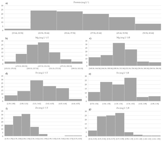 Variability of protein and total and in vitro bioavailable concentrations (mg L−1) of Mg, Fe, and Zn in wheatgrass juice (n = 93); (a) protein (mg L−1): mean ± SD = 38.04 ± 9.70; CV = 25.50%; (b) Mg (mg L−1) T: mean ± SD = 235 ± 31.13; CV = 13.30%; (c) Mg (mg L−1) B: mean ± SD = 202 ± 30.9; CV = 15.20% (d) Fe (mg L−1) T: mean ± SD = 3.57 ± 0.52; CV = 14.70%; (e) Fe (mg L−1) B: mean ± SD = 1.45 ± 0.34; CV = 23.30%; (f) Zn (mg L−1) T: mean ± SD = 2.10 ± 0.37; CV = 17.50%; (g) Zn (mg L−1) B: mean ± SD = 0.70 ± 0.27; CV = 38.30%.