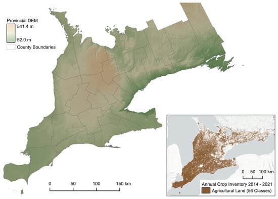 A region covering much of southern Ontario was used as the study area for this research, based on the extent of the classification of all agricultural classes in the ACI from 2014 to 2021 (Figure 1). The study area encompasses 95.1% of the Province’s fruit crops and 97.1% of the Province’s vegetable crops at 187 km2 and 502 km2 respectively [42]. The study area spans 71,500 km2 and covers a wide range of climatic, topographic, and soil characteristics. With this variation, specialty crops are produced in specific areas of the study area, such as grapes and tender fruit along Lake Ontario in the Niagara Region, tomatoes near Leamington in Essex County, and various vegetables in the municipality of Chatham-Kent and the Holland Marsh [43]. The study area includes areas of plant hardiness zone classifications from 4b to 7a, corresponding to minimum plant survival temperature ranges of −31.7 °C to −28.9 °C and −17.8 °C to −15 °C, respectively [44]. The topography of the area is overall low-relief and characterized by rolling hills, with minimum and maximum elevations of 52.0 m and 541.4 m respectively (Figure 1). A large portion of the soils covering this area are grey-brown luvisols [45].