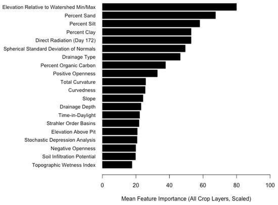 The individual feature importance plots rank all 34 features for each crop layer [88]. The mean most important feature, elevation relative to watershed minimum and maximum, was found to be the most important overall feature for beet_70, beet_80, orchard_80, and potato_60. Elevation relative to watershed minimum and maximum was also the most important of the topographic features for orchard_70, potato_70, potato_80, tomato_60, and tomato_80, with at minimum a soil texture feature preceding. Only three crop layers were found to have a different topographic feature than elevation relative to watershed minimum and maximum as either the most important overall or the most important topographic feature, those being other_veg_70, vineyard_70, and vineyard_80. For other_veg_70, the most important topographic feature was spherical standard deviation of normals, preceded by drainage depth and percent silt. For both vineyard_70 and vineyard_80, direct radiation on Day 172 was the most important feature overall.