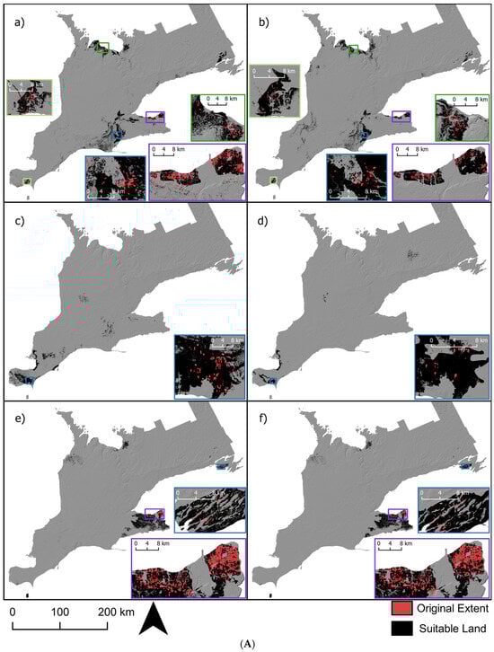 Vineyards and orchards exhibited the highest amount of overlap between crop types, as was expected due to their similar growing conditions [91,94]. Although significantly more research focuses on these crops compared to the other four, it is often in the realm of precision agriculture to enhance flavours, appearance, yield, and processing potential, rather than on land suitability [14,95,96,97]. Precision agriculture research is also more commonly carried out on more specific crop classes, such as a specific type of peaches, cherries, or white grapes [95]. The small differences required for producing specific crop types can impact the quality of the produced crops, thus the model’s predicted area may not be suitable for all the specific crop types listed. Specific crop variant data for specialty crops is not yet available from AAFC and the current orchard class aggregates all orchard sub-crops (e.g., plums, peaches, apples, pears, etc. are all classified as “orchard”). Further research evaluating topography for these specific crop variants would enhance the understanding of crop land suitability and how resiliency can be improved.