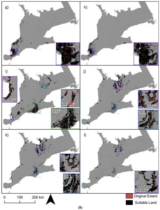 (A) Resulting specialty crop suitability maps for (a) orchard_70; (b) orchard_80; (c) tomato_60; (d) tomato_80; (e) vineyard_70; and (f) vineyard_80. (B) Resulting specialty crop suitability maps for (g) beet_70; (h) beet_80; (i) other_veg_70; (j) potato_60; (k) potato_70; and (l) potato_80.