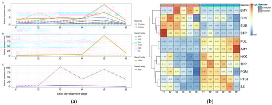 By comparing the average RELs of each of the 32 gene families related to sucrose and starch metabolism between soybean and chickpea, significant differences were observed in SUS, HXK, PGM, FRK, TPP, STP, PTST, SS, PUL, AMY, and BMY between the two species (p-value < 0.05). Among these gene families, BMY, FRK, SUS, and STP showed significantly higher RELs in soybean than in chickpea, while AMY, HXK, PGM, PTST, PUL, SS, and TPP showed significantly higher RELs in chickpea than in soybean (Figure 1b). These eleven differentially expressed gene families showed different RELs at different stages of seed development, as described below.