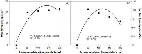 The mass of 1000 grains reached its peak (178.96 g) with a population of 222 thousand plants of soybean ha−1 (Figure 3A).