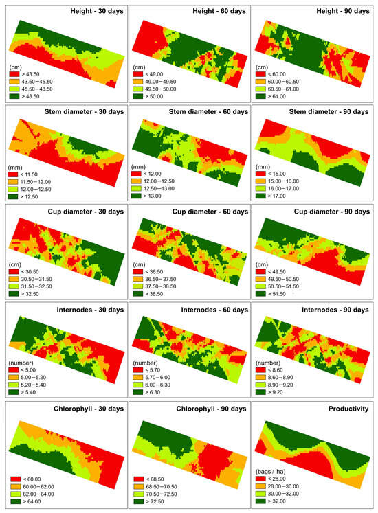 Spatial distribution of height (30, 60, and 90 days), stem diameter (30, 60, and 90 days), cup diameter (30, 60, and 90 days), internodes (30, 60, and 90 days), chlorophyll index (30 days and 90 days), and productivity of coffee trees in an intercropping system.