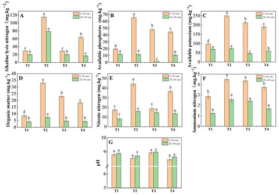 Physicochemical properties after partial replacement of inorganic nitrogen with bio-organic fertiliser. Soil samples were taken at 0–20 cm (orange) and 20–40 cm (green) depths. The data are presented as mean ± standard error. Lowercase letters in the figure represent significant differences in the same soil layer (p < 0.05). (A) alkaline lysis nitrogen, (B) available phosphorus, (C) available potassium, (D) soil organic matter, (E) nitrate nitrogen, (F) ammonium nitrogen, (G) pH.