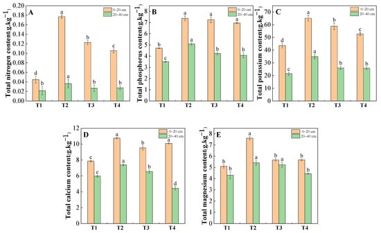 Change in total element content in soil treated by partial replacement of inorganic nitrogen with bio-organic fertiliser. Soil samples were taken at 0–20 cm (orange) and 20–40 cm (green) depths. Different lowercase letters in the figure represent significant differences in the same soil layer (p < 0.05). (A) total nitrogen content, (B) total phosphorus content, (C) total potassium content, (D) total calcium content, (E) total magnesium content.